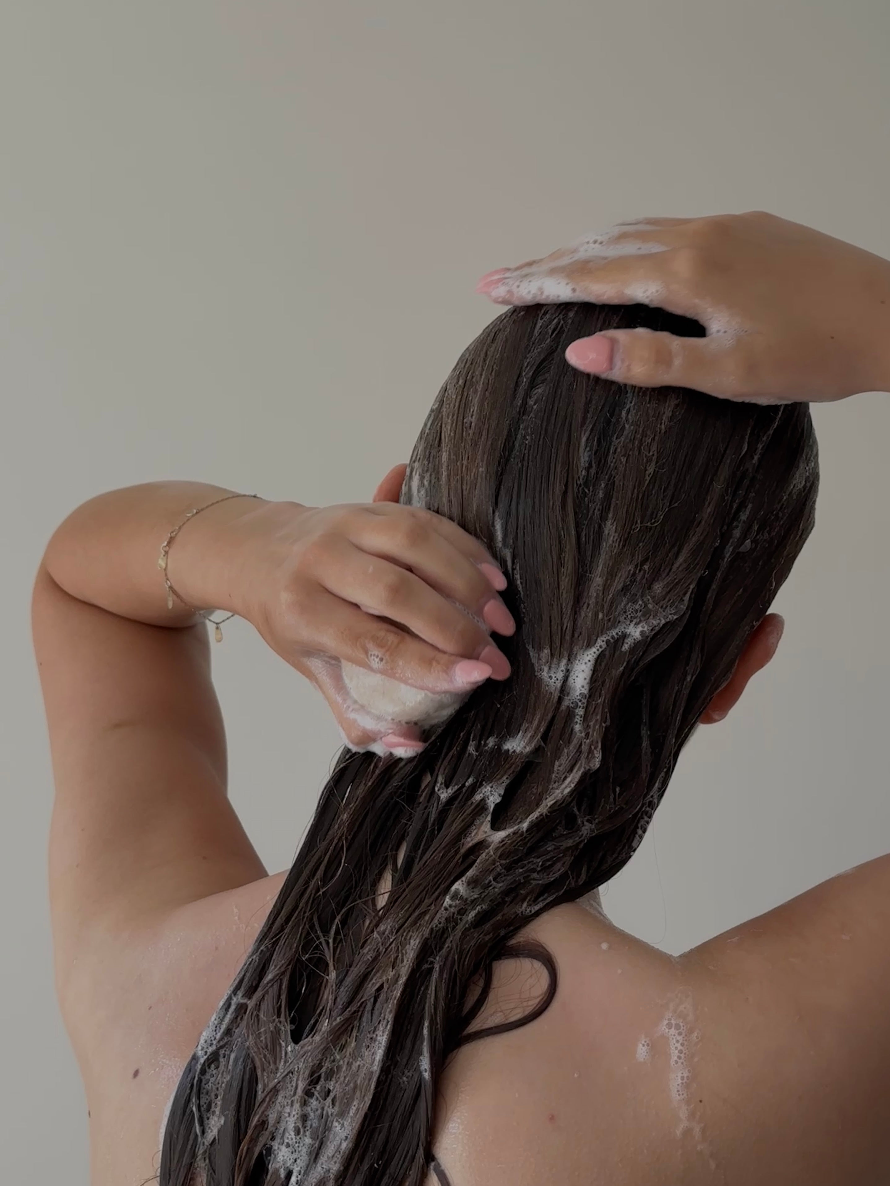 En rolig og bevidst ritual med fokus på korrekt dobbeltrens og pleje af både hår og hovedbund med shampoo- og conditioner bar.